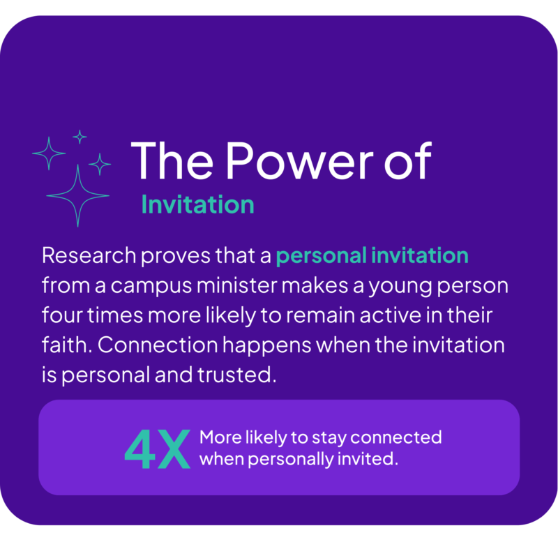 As a Faith Forward Ambassador, you will be equipped to have meaningful conversations with students about campus ministry and connecting to their Catholic community after graduation.